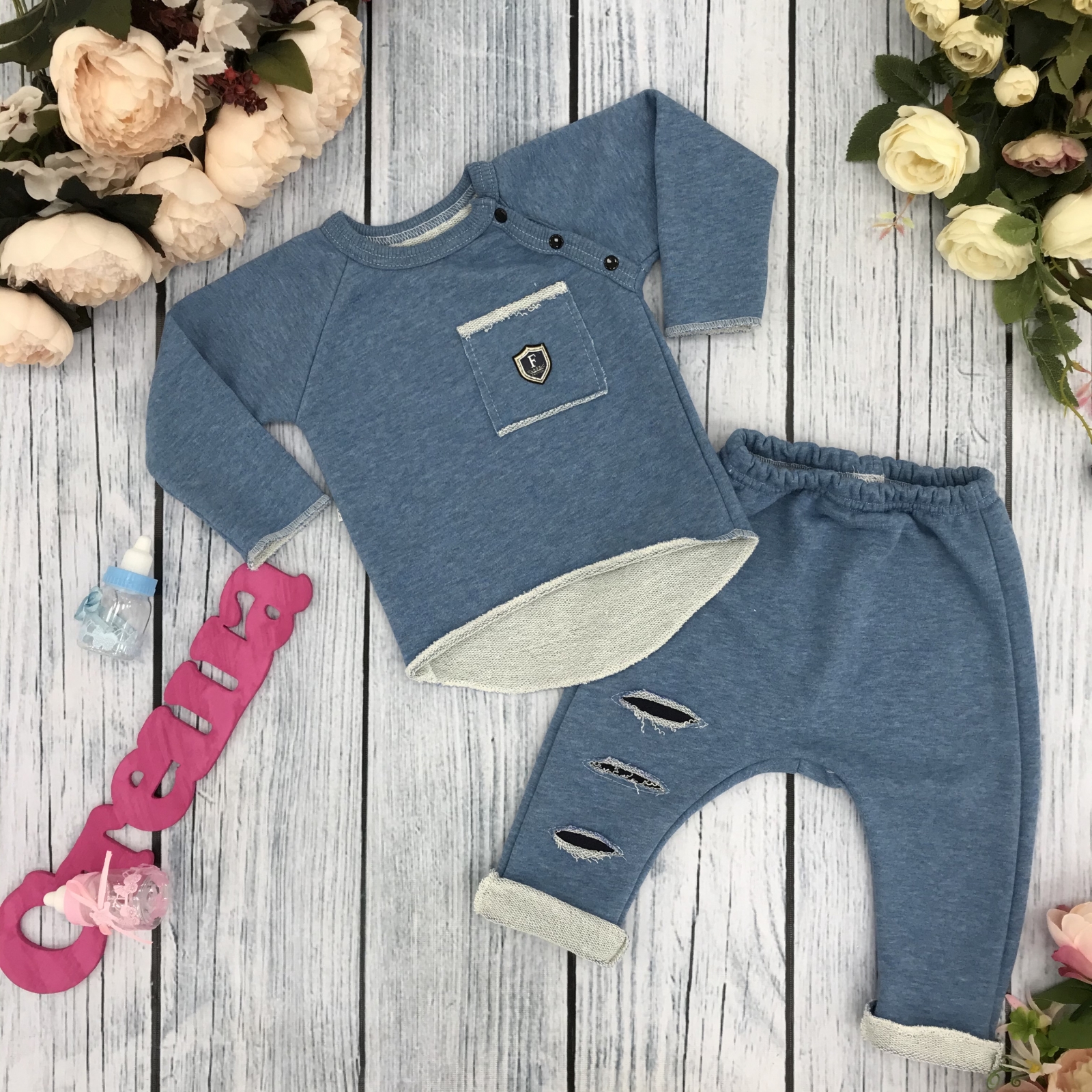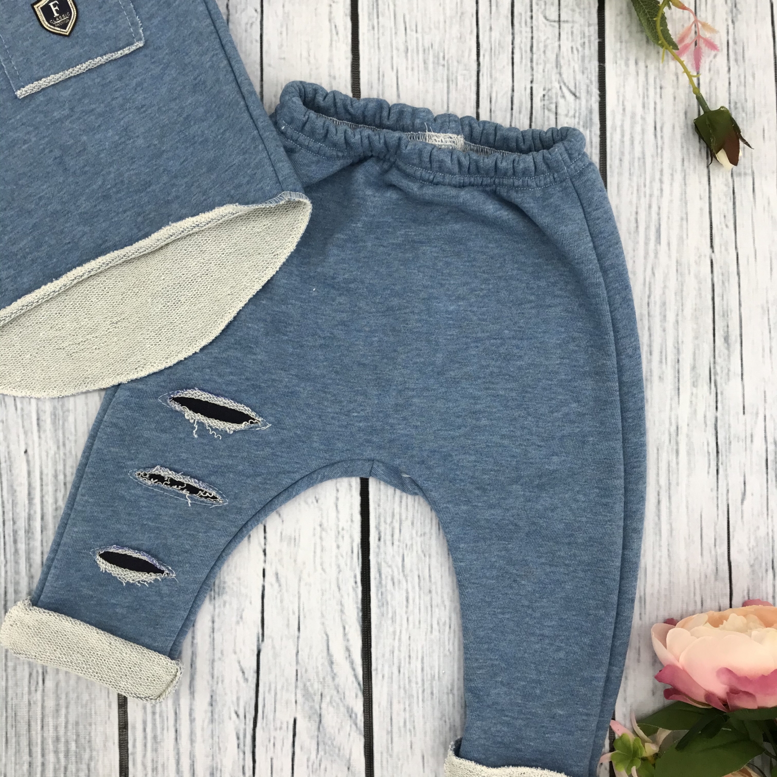239. Костюм ясельный, хлопок 65%, 35% ПЭ, 3-х нитка футер без начеса, джинса 74,80,86